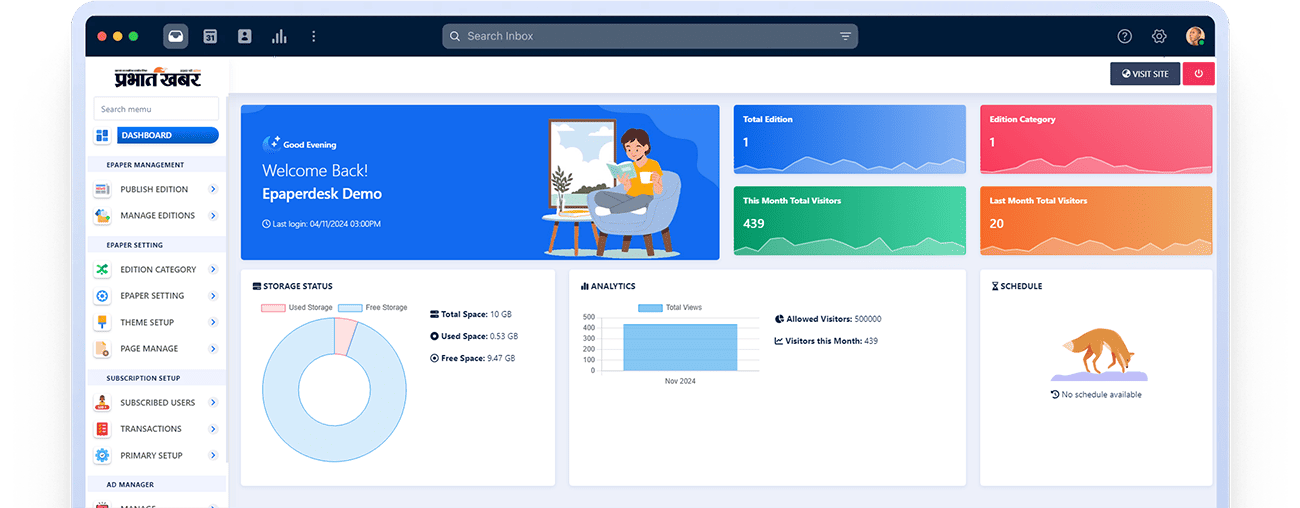 Epaperdesk is the Best News E-paper CMS, offering a real reading experience to your audience with its advanced area mapping feature. Publish your daily newspaper online, allowing readers to access the e-paper on mobile devices, tablets, and computers. Readers can also share the e-paper on social media platforms.